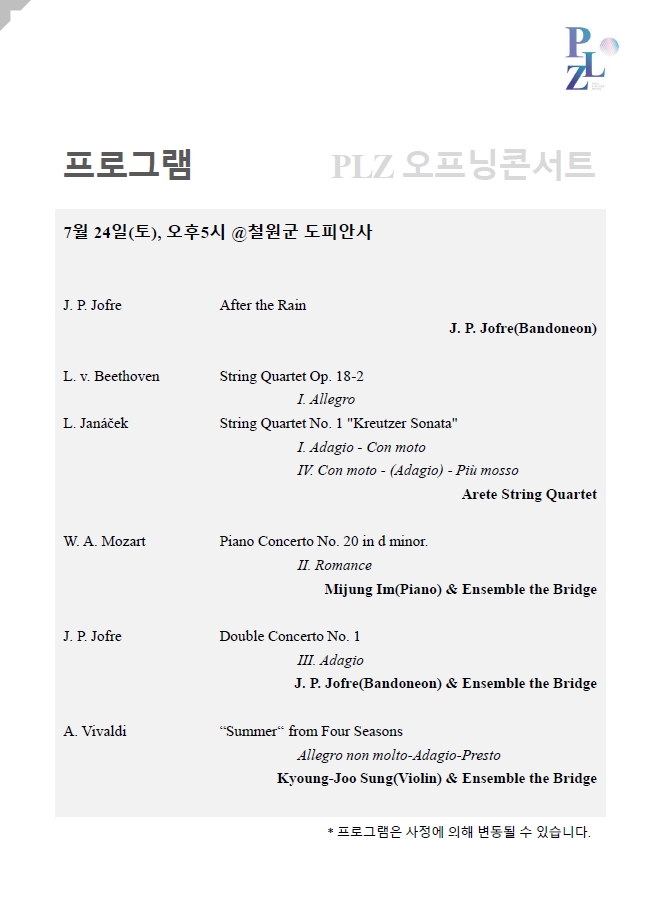 - 출연진 : 임미정(피아노), 제이피 요프리(반도네온), 아레테 콰르텟(현악사중주), 성경주(바이올린) & 앙상블더브릿지