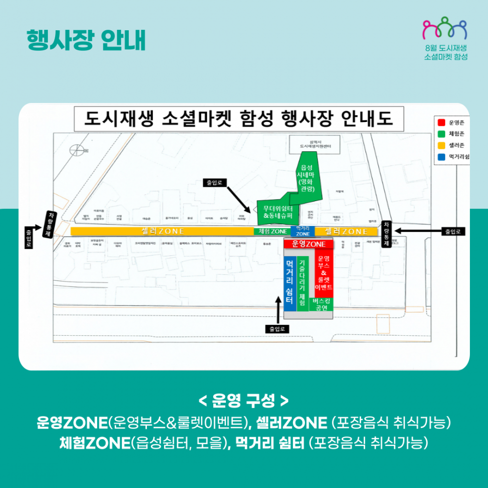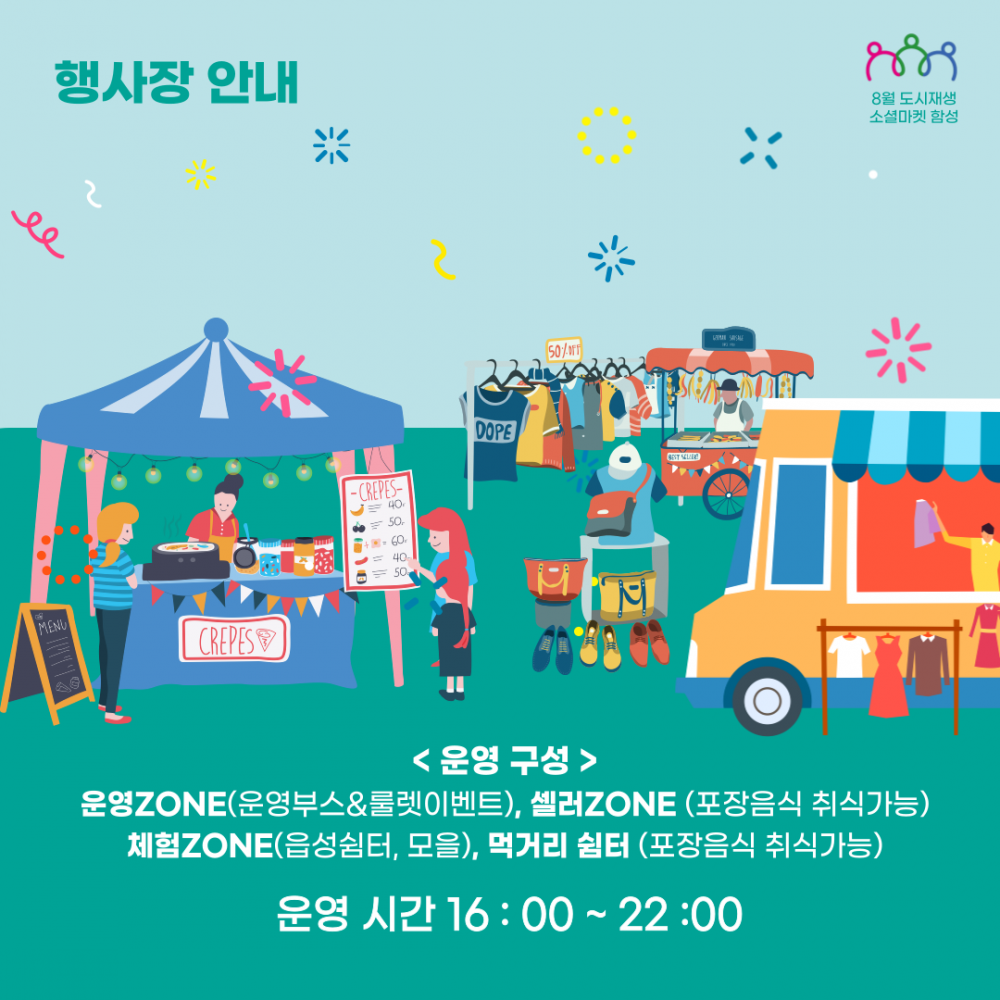 4. 내 용: 소셜마켓, 야외 먹거리 쉼터, 읍성 쉼터 공연, 애기 속닥 기줄다리기, 읍성시네마, 동네슈퍼,