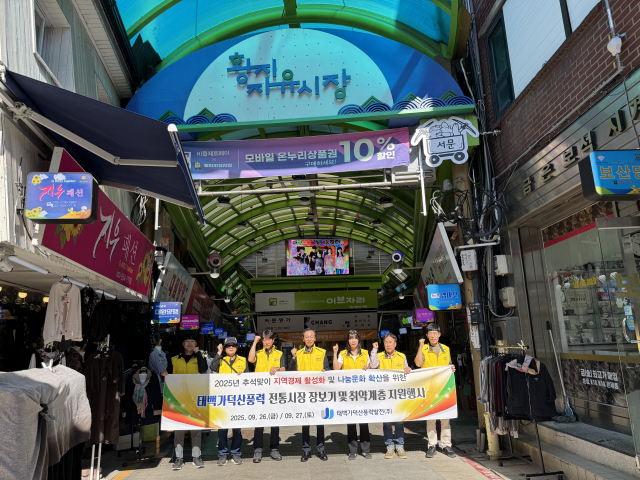 가덕산풍력은 지난 26일 태백 황지자유시장에서 한기덕 대표 등 임직원이 참여한 가운데 지역 소상공인 판로 확대 및 지역 경제 활성화를 위한 전통시장 장보기 행사를 진행했다.