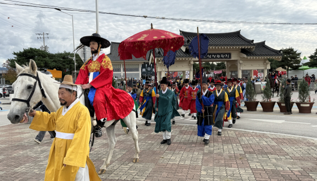 【철원】세종대왕이 재위 기간 철월 일대를 찾아 사냥과 군사훈련을 실시했던 모습을 재현한 '2025 세종대왕 철원 강무행차'가 19일 고석정 국민관광지 및 고석정꽃밭 일원에서 개최됐다. 취타대를 선두로 말을 타고 이동하는 세종대왕이 고석정 관광정보센터를 출발, 고석정꽃밭에 마련된 특설무대까지 행렬했다. 특설무대에서는 세종대왕이 주관하는 군대의 진법 훈련과 전통문화 공연 등이 펼쳐져 객석을 채운 관객들의 박수를 이끌어 냈다.