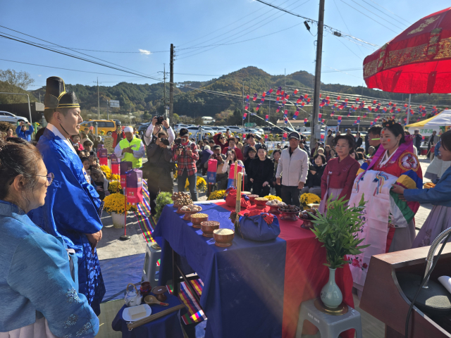 백년해로를 상징하는 기러기 한 쌍을 놓고 예식이 시작됐다. 이정근 이장의 주관 아래 전안례, 교배례, 합근례가 진행됐다.