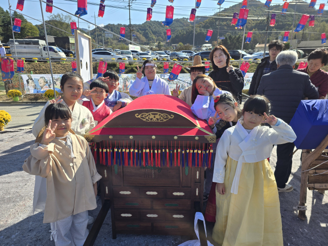 ◇홍천군 화촌면 장평1리 청사초롱 마을이 1일 마을회관 앞에서 주최한 제2회 전통혼례 축제에 참가한 홍천희망아동센터의 어린이들. 사진=신하림기자