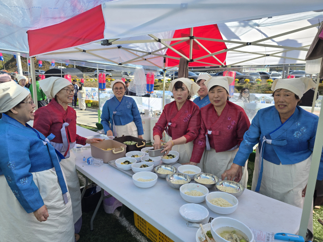 ◇홍천군 화촌면 장평1리 청사초롱 마을이 1일 마을회관 앞에서 주최한 제2회 전통혼례 축제. 부녀회 회원들이 다양한 음식을 정성껏 준비했다. 사진=신하림기자