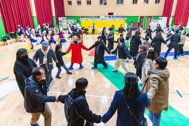 ◇춘천사암리농악보존회가 오는 8일 춘천 동내초교와 및 동내면행정복지센터 일대에서 ‘대룡산 공지어 축제’를 연다. 사진은 지난해 축제 당시. 춘천사암리농악보존회 제공이날 축제는 동내면 이장단의 물맞이로 시작된다. 이어 유진규 마이미스트의 공연이 펼쳐지며, 동내초교 어린이농악단의 판제, 김흥남 마이미스트의 공지어 노래·춤 배우기 등 다양한 무대가 진행된다. 홍성순의 설장구 공연과 주민 모두가 참여하는 강강술래도 축제의 분위기를 고조한다.