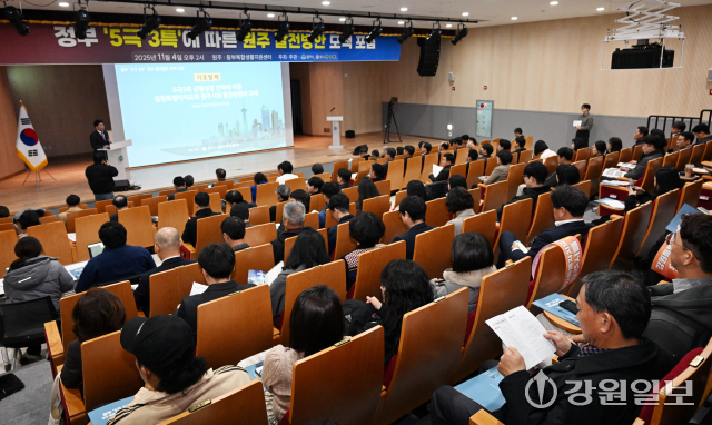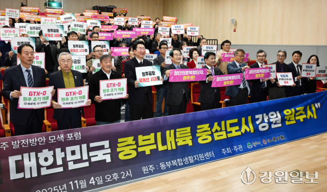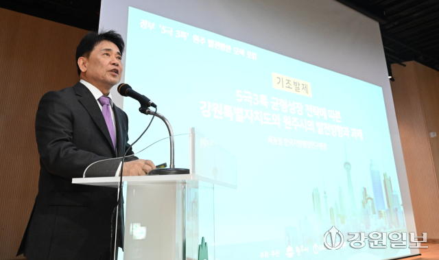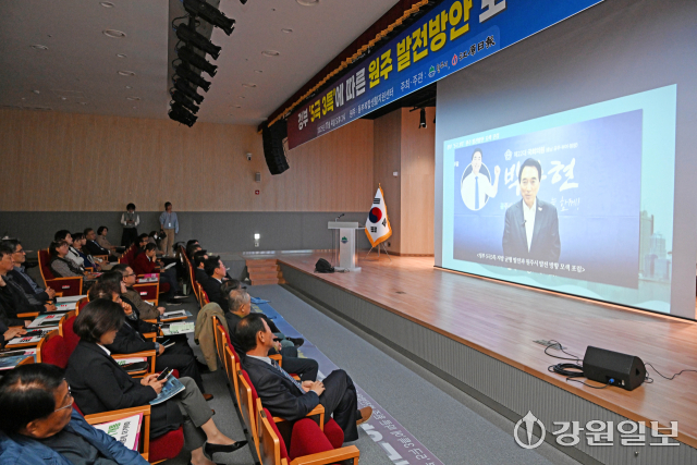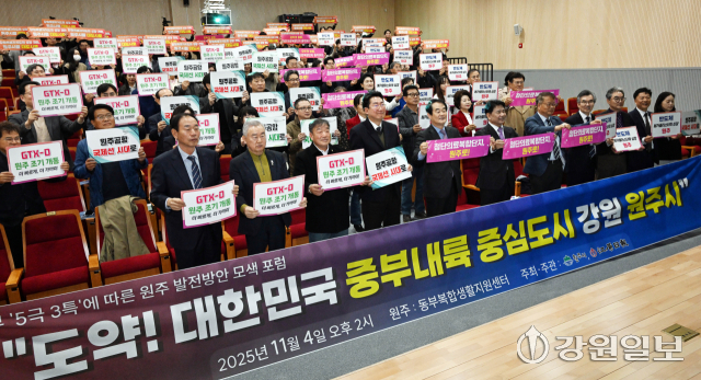 정부 5극 3특 계획에 따른 원주 발전방안 모색 포럼이 4일 원주 동부복합생활지원센터에서 박진오 강원일보 사장, 원강수 원주시장, 곽문근 원주시의회 부의장을 비롯한 내빈들이 참석한 가운데 열렸다.