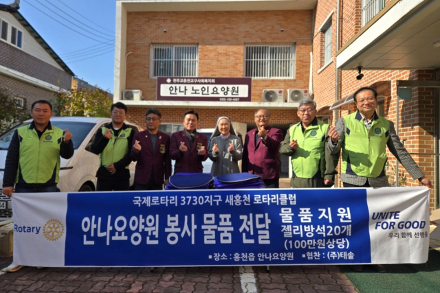 국제로타리 3730지구 새홍천로타리클럽(회장:박기출)은 최근 천주교춘천교구사회복지회에서 운영하는 안나 노인요양원을 방문해 어르신 맞춤형 기능성 젤리방석 20세트(100만원 상당)를 후원했고, 서면행정복지센터에도 전기장판 20개(100만원 상당)를 전달했다.