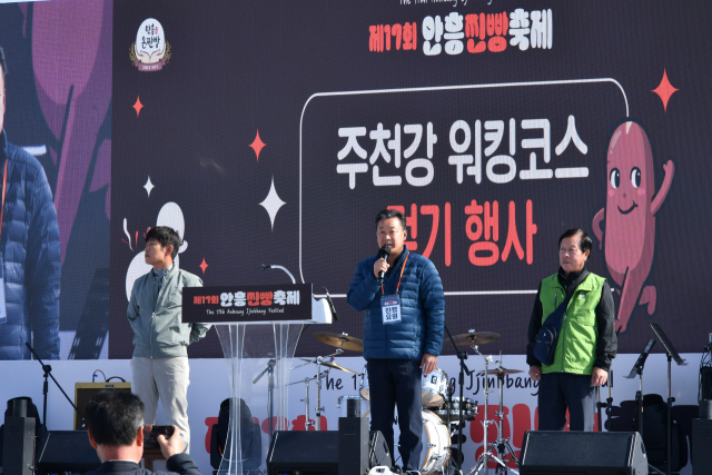 ◇제17회 안흥찐빵축제가 7일 횡성군 안흥면 안흥찐빵모락모락마을 일원에서 개막돼 성락 축제위원장이 행사 첫날 열린 주천강 워킹코스 걷기행사에서 인사말을 하고 있다.