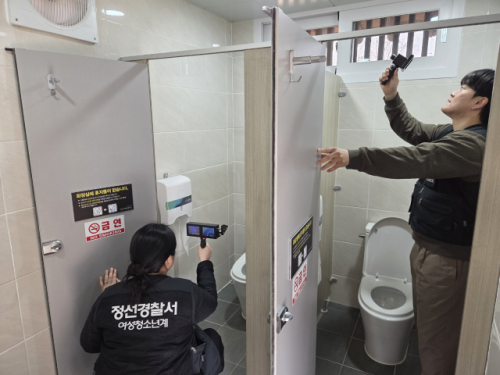 정선경찰서(서장:이진호)가 지난 16일부터 오는 4월 30일까지 지역 내 다중 밀집 장소를 대상으로 성 범죄 예방을 위한 불법 카메라 탐지를 실시한다. 사진은 17일 정선읍 아라리촌 공중화장실 불법 카메라를 탐지하는 모습.
