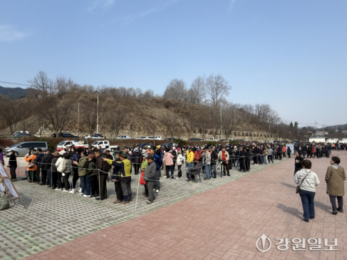 2025 나무 나눠주기 행사에 참가한 양구지역 주민들이 나무를 받기 위해 줄을 서고 기다리고 있다.