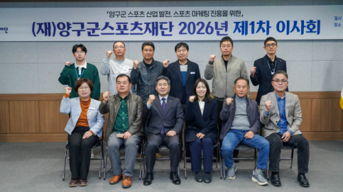 (재)양구군스포츠재단은 26일 군청 중회의실에서 2026년 제1차 이사회를 개최했다. 이날 회의에서는 2025회계연도 결산 및 감사보고, 2026년도 제1회 추가경정예산안, 제규정 개정안 등을 심의·의결했다.