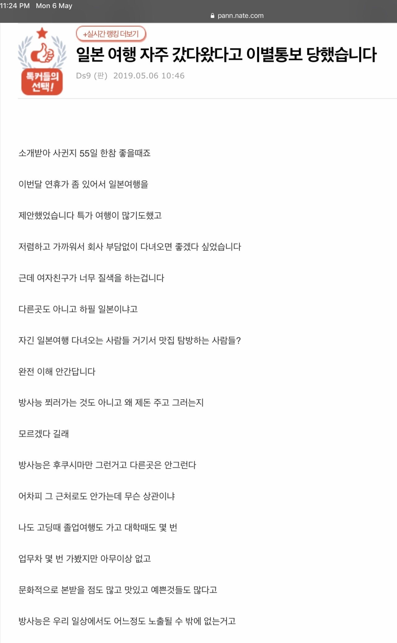 일본여행 자주 갔다왔다고 이별통보 당했습니다