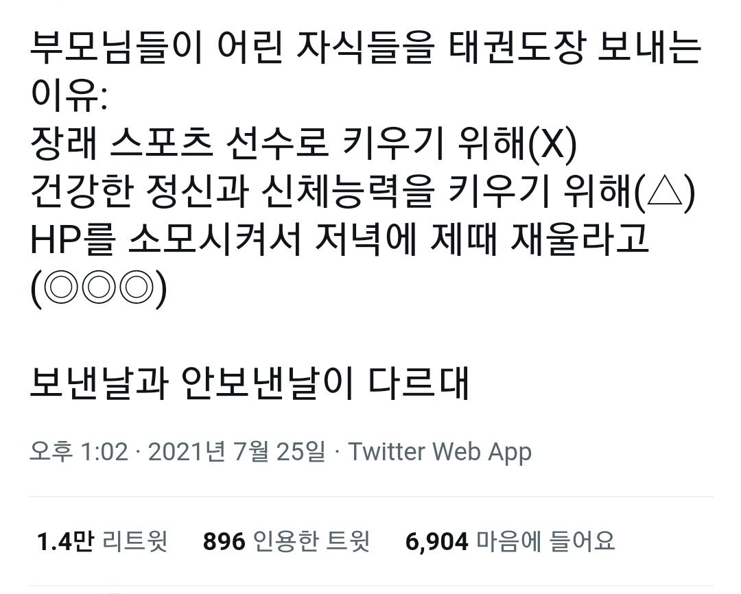 부모님들이 어린 자식들을 태권도장 보내는 이유