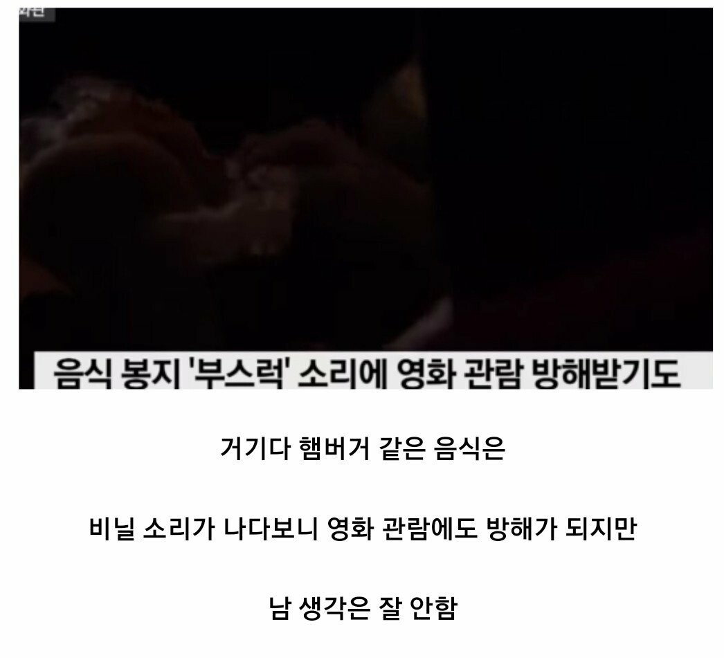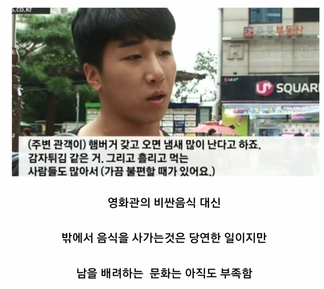 갠적으로 정말 이해가 안됨... 집에서야 편하게 뭐 먹으면서 영화 보지만 공공장소에서 남들 생각은 전혀 안하나...