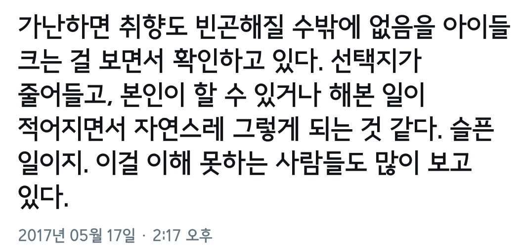 가난하면 취향도 빈곤해질 수밖에 없음을 아이들 크는 걸 보면서 확인하고 있다.