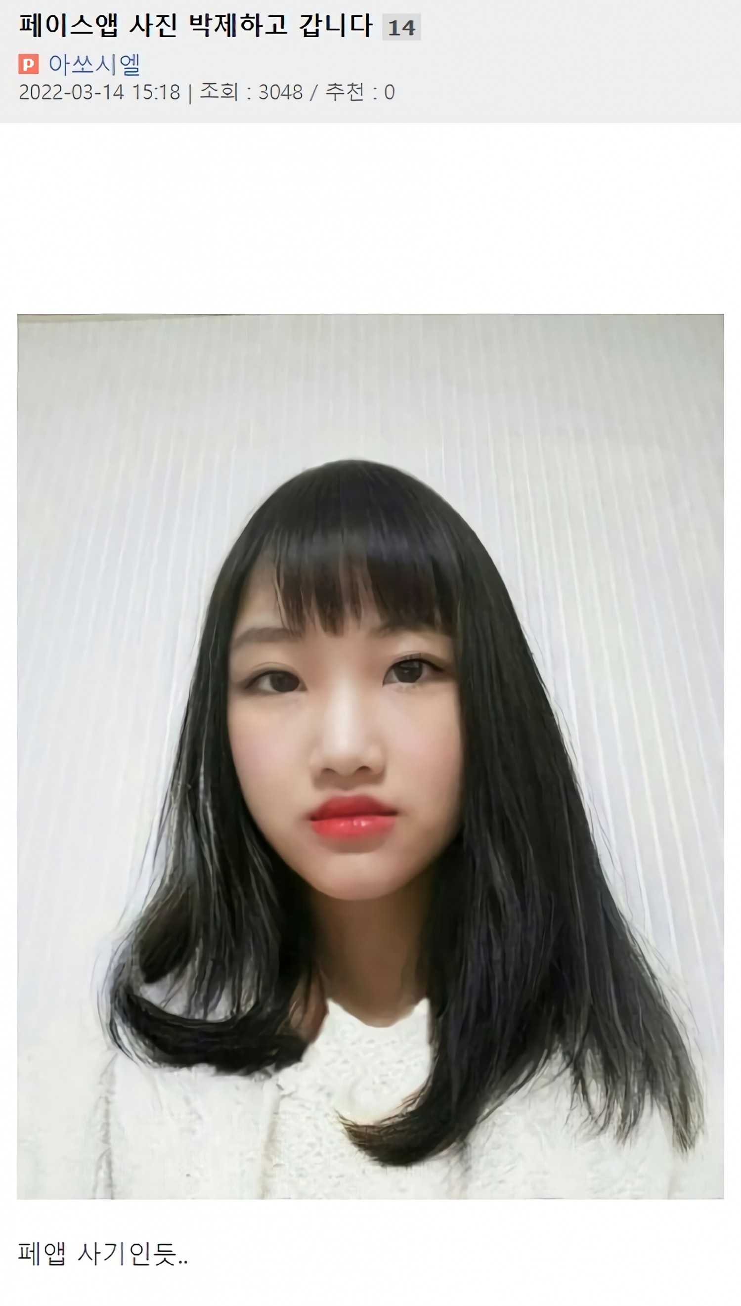 페이스앱 여장 대참사.jpg Home자유글유머 > 160367 허정력사마 허정력사마님의 홈 전체게시물 홈페이지 아이디로 검색 허정력사마님의 홈 전체게시물 홈페이지 아이디로 검색 2023.09.25 02:30 1,463 0 46 LV.1 11% 신고 목록 게시글 신고 안내 아래 내용중 해당하는 내용이 있을경우 아래 게시글신고 버튼을 클릭하시고 사유를 작성해주시면 빠른시간 안에 삭제및 필요조치하여 드리겠습니다. 로그인후 이용이 가능합니다. 그리고 답변은 메뉴 아이러브강원 > 1:1문의에서 확인이 가능합니다. 자신 또는 제3자를 비방하거나 중상 모략으로 명예를 손상시키는 내용 범죄행위와 관련이 있다고 판단되는 내용 다른 회원 또는 제3자의 저작권 등 기타 권리를 침해하는 내용 타인의 개인정보, 사생활을 침해하거나 명예를 손상시키는 경우 자신의 글을 타인이 도용한 경우 위의 내용 이외에 기타사항 본문 페앱 여장 대참사인것ㅋㅋ 46 로그인 후 추천을 하실 수 있습니다. 추천한 회원 다이올 다이올님의 홈 전체게시물 아이디로 검색 다이올님의 홈 전체게시물 아이디로 검색 허정력사마 님의 최신글 허정력사마 님의 최신댓글 유머 - 겨울맞이 눈오리집게 근황 2025-10-27 유머 - 내 여자친구에게 사랑한다고 전해줘 2025-10-18 Q&A - 여자는 방목형 남자 싫어하죠?외롭자나요 ㅠㅠ 2025-10-07 Q&A - 아뇨. 방목 했다가 다정하게 대해줄 때도 있고 하니깐결과적으로 여자마다 다른 거라고 봅니다.계쏙 집중하는 것도 부담이니까요. 2025-10-07 허정력사마 님의 최신글 허정력사마 님의 최신댓글 유머 - 겨울맞이 눈오리집게 근황 2025-10-27 유머 - 내 여자친구에게 사랑한다고 전해줘 2025-10-18 Q&A - 여자는 방목형 남자 싫어하죠?외롭자나요 ㅠㅠ 2025-10-07 Q&A - 아뇨. 방목 했다가 다정하게 대해줄 때도 있고 하니깐결과적으로 여자마다 다른 거라고 봅니다.계쏙 집중하는 것도 부담이니까요. 2025-10-07 SNS 댓글목록 0 등록된 댓글이 없습니다.