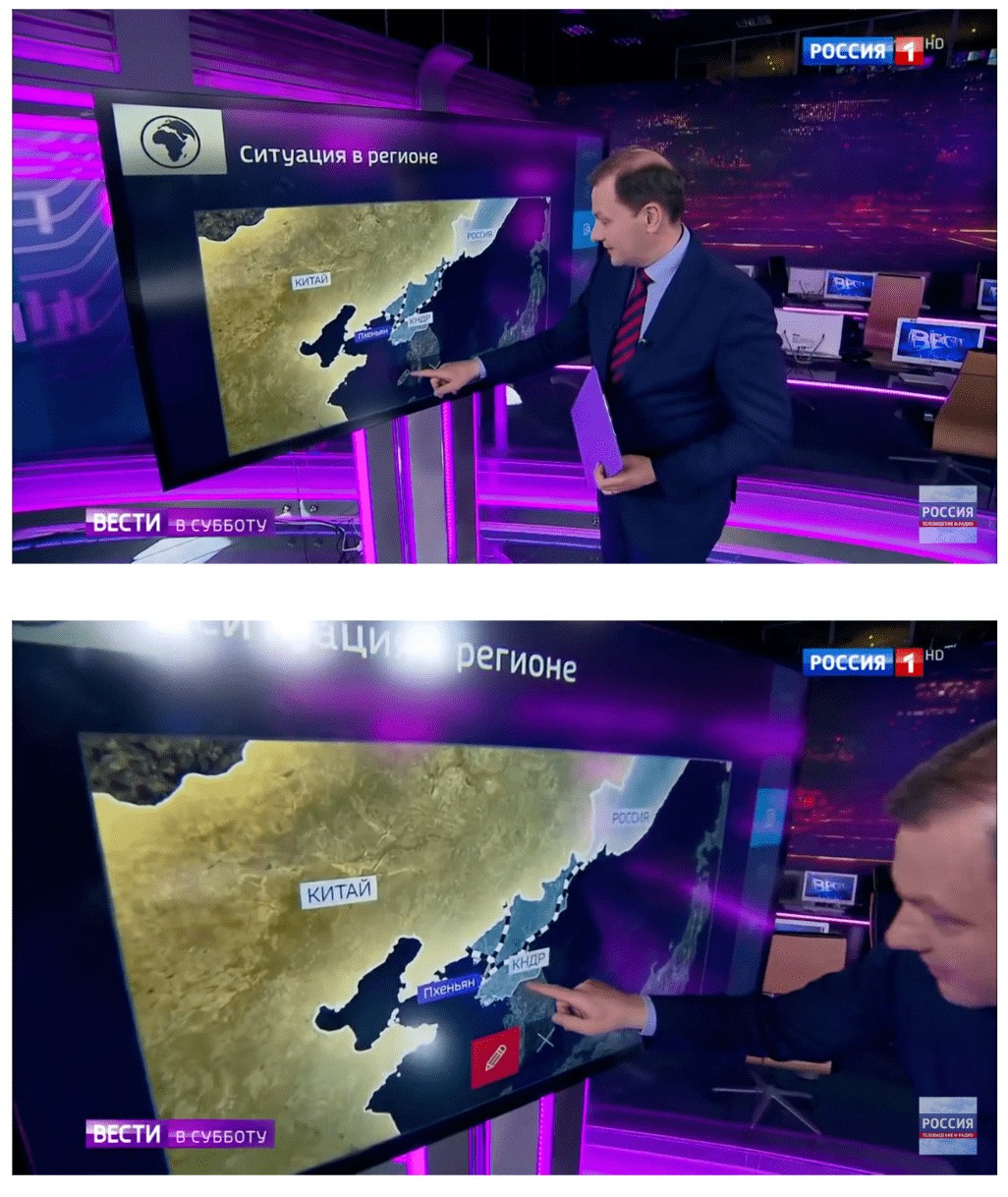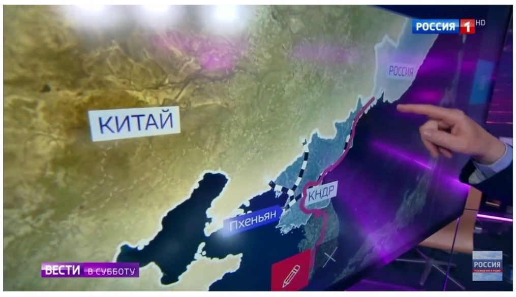 국영방송 뉴스 프로그램에서 뉴스 앵커가 직접 지도에 그려 가면서 시베리아 횡단철도를 한국까지 연결하는 즐거운 상상을 하고 있음