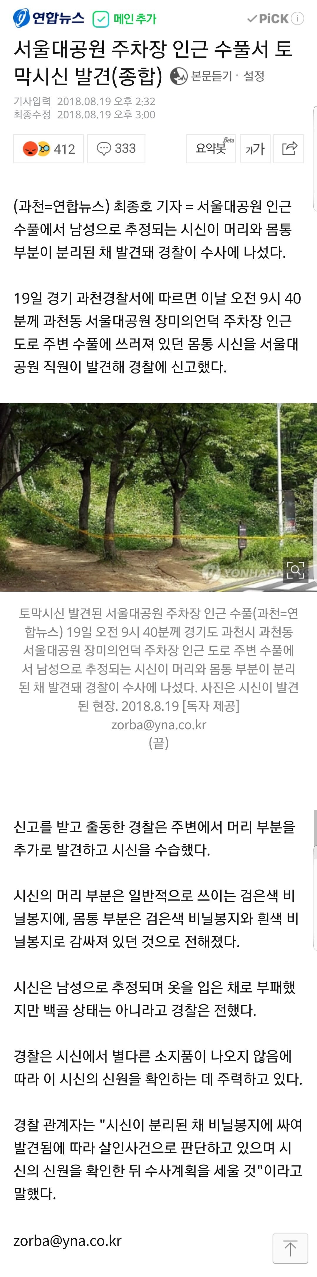 서울대공원 주차장인근서 토막시신 발견