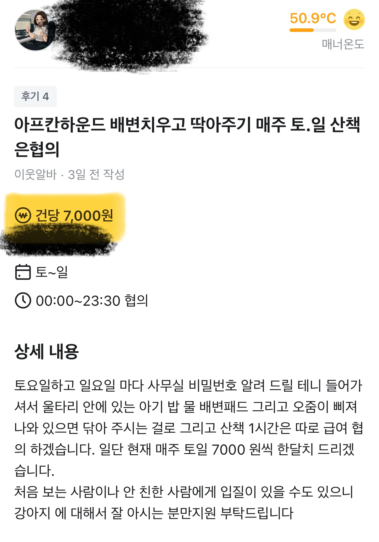 입질하는 대형견의 산책 + 밥 + 물 + 배변패드 + 청소 = 7000원