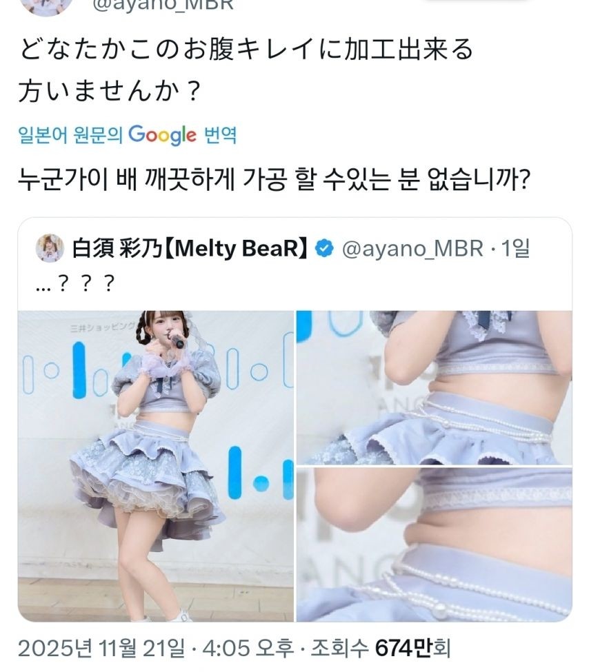 사진에 뱃살이 찍혀 당황해서 뽀샵 수정 부탁한 일본 아이돌