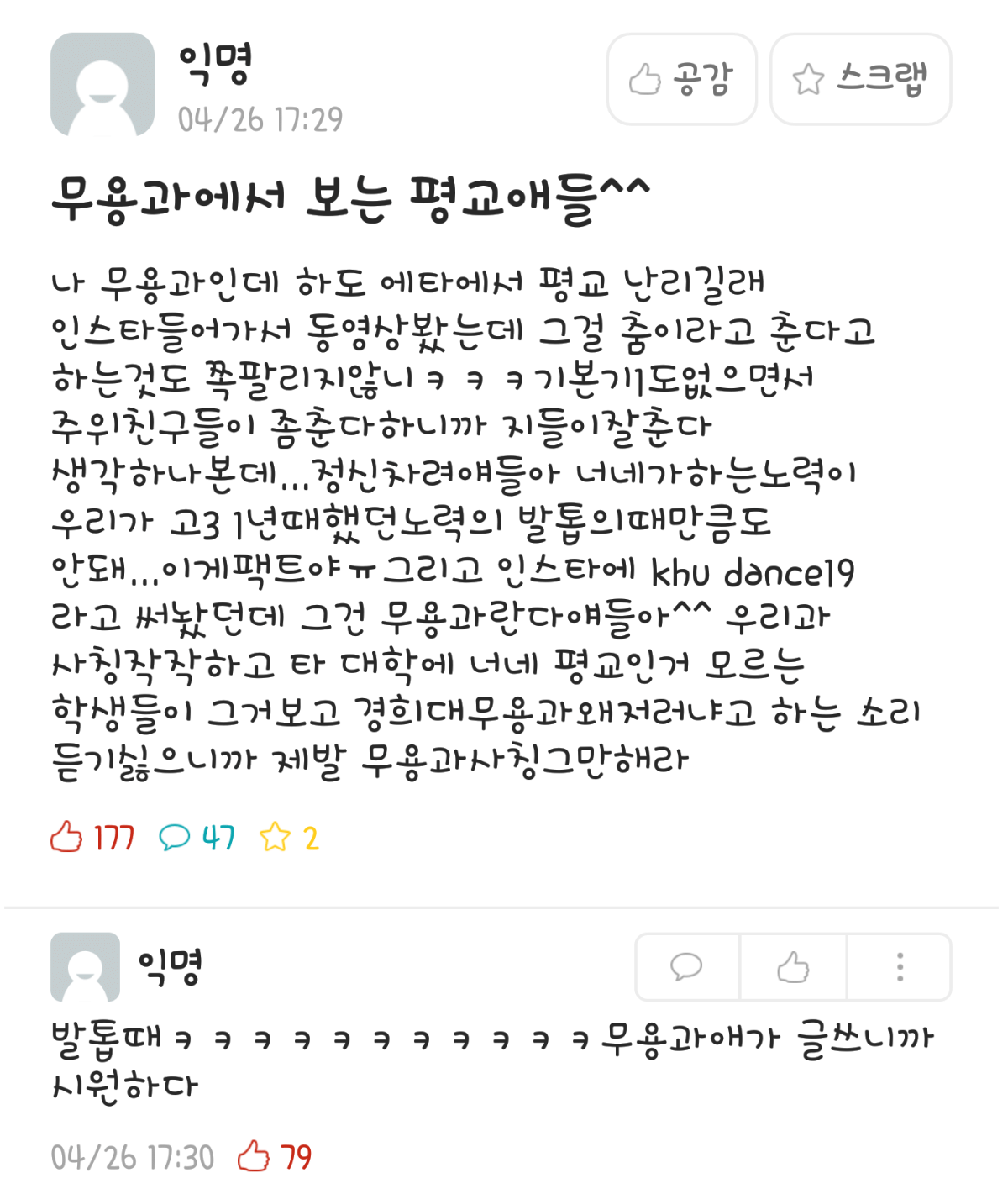 그런데 실용무용과 학생들이 본인의 페북, 인스타에 서울캠퍼스 실용무용'과'라고 올리는게 학과 창조/ 사칭을 하는게 아니냐는 논란이 생김