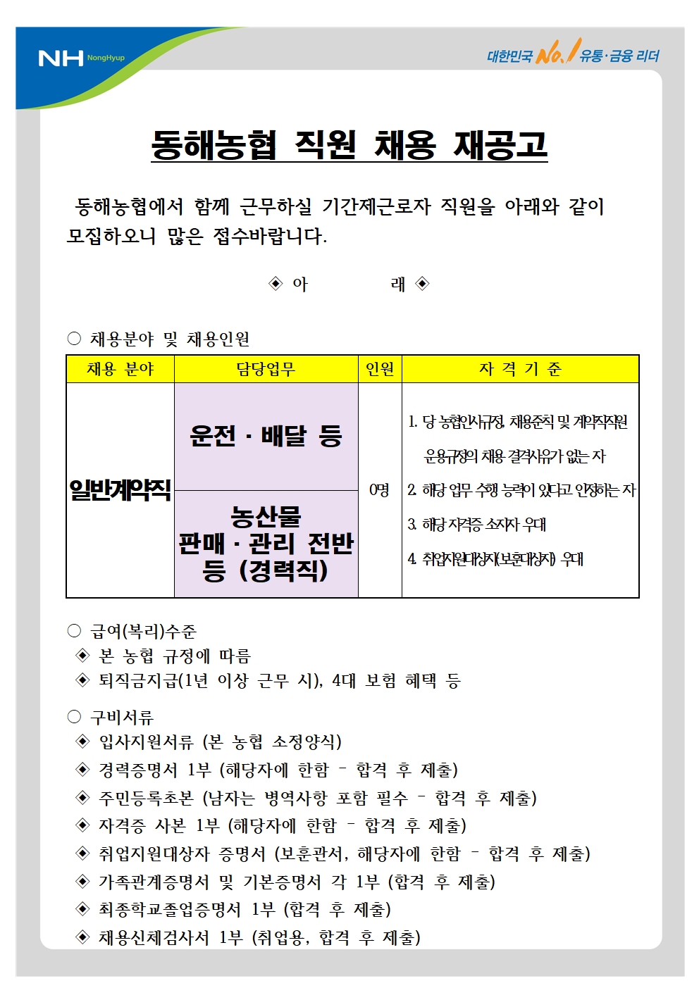 [동해시/구인] 직원(운전·배달 등, 농산물 판매·관리 전반 등 (경력직)) 채용 재공고