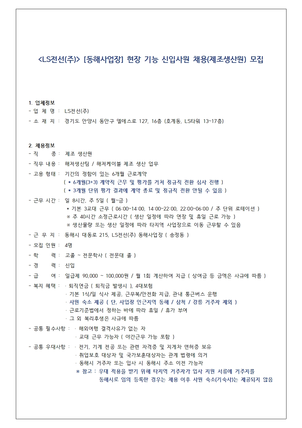 [동해시/구인] [동해사업장] 현장 기능 신입사원 채용(제조생산원) 모집