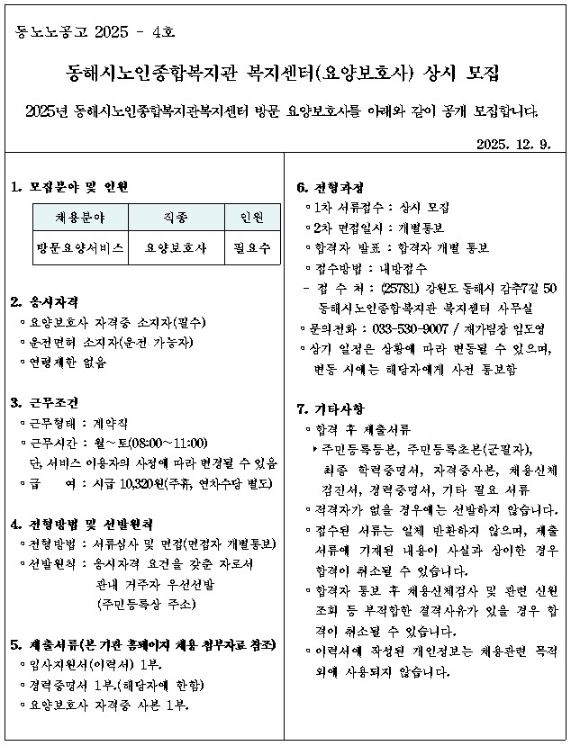 - 직무 내용 : 방문 요양 서비스 제공 업무 ( 신체활동 및 가사활동 지원, 일상생활 지원, 정서 지원 등 )