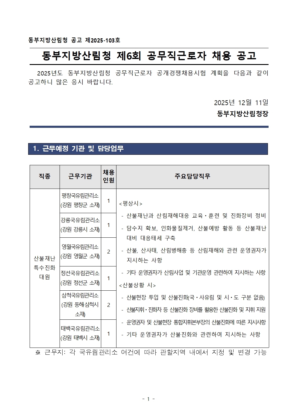 [동해시/구인] 제6회 공무직근로자(산불재난 특수진화 대원) 채용 공고