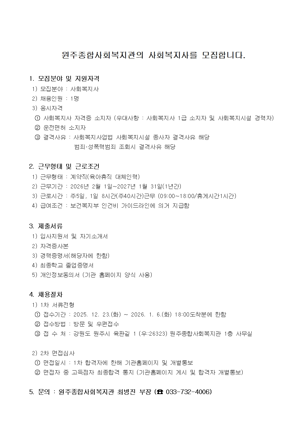 [원주시/구인] 『원주종합사회복지관』 사회복지사(계약직) 채용 공고