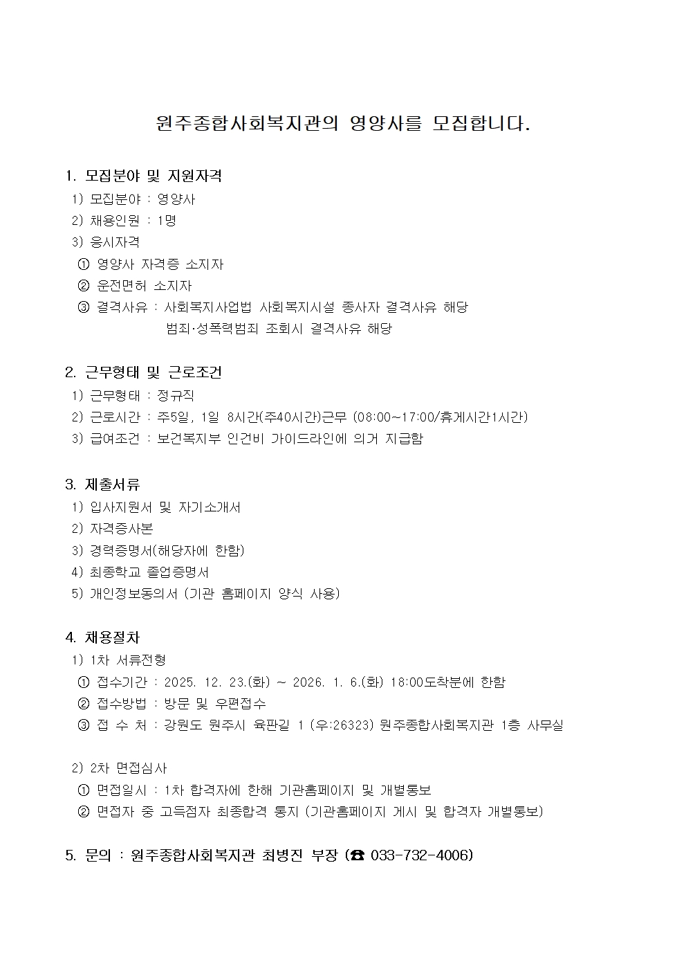 [원주시/구인] 『원주종합사회복지관』 영양사 채용 공고