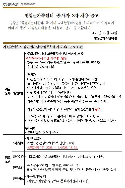 [평창군/구인] 평창군가족센터 교육활동비사업 팀원 2차 채용공고 Home채용정보97130 자미나타불 자미나타불님의 홈 전체게시물 아이디로 검색 자미나타불님의 홈 전체게시물 아이디로 검색 2025.12.24 16:20 869 0 0 LV.1 20% 첨부파일 : () 다운로드 관련링크 : https://www.pc.go.kr/portal/participation/participation-openplace/participation-openplace-guin?articleSeq=322230 102회 연결 신고 목록 게시글 신고 안내 아래 내용중 해당하는 내용이 있을경우 아래 게시글신고 버튼을 클릭하시고 사유를 작성해주시면 빠른시간 안에 삭제및 필요조치하여 드리겠습니다. 로그인후 이용이 가능합니다. 그리고 답변은 메뉴 아이러브강원 > 1:1문의에서 확인이 가능합니다. 자신 또는 제3자를 비방하거나 중상 모략으로 명예를 손상시키는 내용 범죄행위와 관련이 있다고 판단되는 내용 다른 회원 또는 제3자의 저작권 등 기타 권리를 침해하는 내용 타인의 개인정보, 사생활을 침해하거나 명예를 손상시키는 경우 자신의 글을 타인이 도용한 경우 위의 내용 이외에 기타사항 본문 평창군가족센터 교육활동비사업 팀원 2차 채용공고 [출처 : 평창군청 -채용정보-] 0 로그인 후 추천을 하실 수 있습니다. 자미나타불 님의 최신글 자미나타불 님의 최신댓글 채용정보 - (긴급)평창시니어클럽 노인일자리 담당자 공개 채용 공고 2시간 47분전 채용정보 - [모집공고] 국립생물자원관_2026년 생물다양성 교육 현장 인력 양성과정 교육생 모집공고 18시간 47분전 채용정보 - 평창군선거관리위원회 공정선거지원단 모집 안내 2026-03-09 시군별소식 - 2026년 평창 치유의 숲 치유센터 운영 안내 2026-03-07 채용정보 - 평창농자재마트 아르바이트, 직원 채용 2026-03-07 채용정보 - [휘닉스파크] 단지내 남자 사우나 관리 아르바이트모집 2026-03-05 채용정보 - 2026년 제3차 국립조선왕조실록박물관 공무직 등 근로자(조리원, 시설물청소원) 공개채용공고 2026-03-05 시군별소식 - 2026년 해빙기 안전점검 주민점검신청제 안내(2026.2.19.~3.31.) 2026-03-05 Q&A - 고창 동호해수욕장 물때표 입니다7월27일 간조시간은 11시39분 23시37분입니다오전을 기준으로 9시47분부터 13시39분까지 조개체험을 하면 됩니다이날은 9물 사리물때로 조개체험하기에 좋은날입니다 2026-02-26 자미나타불 님의 최신글 자미나타불 님의 최신댓글 채용정보 - (긴급)평창시니어클럽 노인일자리 담당자 공개 채용 공고 2시간 47분전 채용정보 - [모집공고] 국립생물자원관_2026년 생물다양성 교육 현장 인력 양성과정 교육생 모집공고 18시간 47분전 채용정보 - 평창군선거관리위원회 공정선거지원단 모집 안내 2026-03-09 시군별소식 - 2026년 평창 치유의 숲 치유센터 운영 안내 2026-03-07 채용정보 - 평창농자재마트 아르바이트, 직원 채용 2026-03-07 채용정보 - [휘닉스파크] 단지내 남자 사우나 관리 아르바이트모집 2026-03-05 채용정보 - 2026년 제3차 국립조선왕조실록박물관 공무직 등 근로자(조리원, 시설물청소원) 공개채용공고 2026-03-05 시군별소식 - 2026년 해빙기 안전점검 주민점검신청제 안내(2026.2.19.~3.31.) 2026-03-05 Q&A - 고창 동호해수욕장 물때표 입니다7월27일 간조시간은 11시39분 23시37분입니다오전을 기준으로 9시47분부터 13시39분까지 조개체험을 하면 됩니다이날은 9물 사리물때로 조개체험하기에 좋은날입니다 2026-02-26 SNS 댓글목록 0 등록된 댓글이 없습니다.