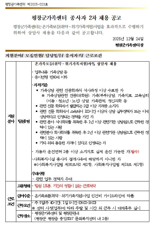 [평창군/구인] 평창군가족센터 온가족보듬(취약·위기가족지원)사업 상담사 2차 채용 공고 Home채용정보97131 텔레비전 텔레비전님의 홈 전체게시물 아이디로 검색 텔레비전님의 홈 전체게시물 아이디로 검색 2025.12.24 16:20 892 0 0 LV.1 79% 첨부파일 : () 다운로드 관련링크 : https://www.pc.go.kr/portal/participation/participation-openplace/participation-openplace-guin?articleSeq=322231 123회 연결 신고 목록 게시글 신고 안내 아래 내용중 해당하는 내용이 있을경우 아래 게시글신고 버튼을 클릭하시고 사유를 작성해주시면 빠른시간 안에 삭제및 필요조치하여 드리겠습니다. 로그인후 이용이 가능합니다. 그리고 답변은 메뉴 아이러브강원 > 1:1문의에서 확인이 가능합니다. 자신 또는 제3자를 비방하거나 중상 모략으로 명예를 손상시키는 내용 범죄행위와 관련이 있다고 판단되는 내용 다른 회원 또는 제3자의 저작권 등 기타 권리를 침해하는 내용 타인의 개인정보, 사생활을 침해하거나 명예를 손상시키는 경우 자신의 글을 타인이 도용한 경우 위의 내용 이외에 기타사항 본문 평창군가족센터 온가족보듬(취약·위기가족지원)사업 상담사 2차 채용 공고 [출처 : 평창군청 -채용정보-] 0 로그인 후 추천을 하실 수 있습니다. 텔레비전 님의 최신글 텔레비전 님의 최신댓글 시군별소식 - 평창군 일반임기제공무원(평생교육사) 임용시험 시행계획 재공고 13시간 55분전 채용정보 - 안정정육식당 주방 보조직원 구함 2026-03-08 시군별소식 - ’26년 물 공급 취약지역 안심지하수 지원사업 2026-03-07 채용정보 - 기간제근로자 구인공고(나이무관) 2026-03-05 채용정보 - 영아연장반 담임교사채용 2026-03-04 채용정보 - 2026년 "평창문에대학" 수강생 모집 공고 2026-03-03 유머 - 아내한테 플스 산거 걸려도 환불 안 해도 되는 경우 2026-03-02 채용정보 - 평창군 도시재생지원센터 직원 채용공고 알림 2026-03-02 유머 - ㅎㅎㅎ 그림이랑 똑 같아요 2026-02-20 텔레비전 님의 최신글 텔레비전 님의 최신댓글 시군별소식 - 평창군 일반임기제공무원(평생교육사) 임용시험 시행계획 재공고 13시간 55분전 채용정보 - 안정정육식당 주방 보조직원 구함 2026-03-08 시군별소식 - ’26년 물 공급 취약지역 안심지하수 지원사업 2026-03-07 채용정보 - 기간제근로자 구인공고(나이무관) 2026-03-05 채용정보 - 영아연장반 담임교사채용 2026-03-04 채용정보 - 2026년 "평창문에대학" 수강생 모집 공고 2026-03-03 유머 - 아내한테 플스 산거 걸려도 환불 안 해도 되는 경우 2026-03-02 채용정보 - 평창군 도시재생지원센터 직원 채용공고 알림 2026-03-02 유머 - ㅎㅎㅎ 그림이랑 똑 같아요 2026-02-20 SNS 댓글목록 0 등록된 댓글이 없습니다.
