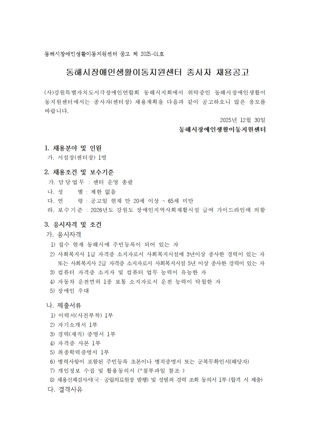 <동해시장애인생활이동지원센터> 센터장 모집