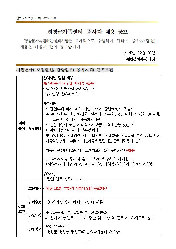 [평창군/구인] 평창군가족센터 종사자(센터사업 팀원) 채용 공고 Home채용정보97228 자미나타불 자미나타불님의 홈 전체게시물 아이디로 검색 자미나타불님의 홈 전체게시물 아이디로 검색 2025.12.30 20:20 857 0 0 LV.1 20% 첨부파일 : () 다운로드 관련링크 : https://www.pc.go.kr/portal/participation/participation-openplace/participation-openplace-guin?articleSeq=322663 119회 연결 신고 목록 게시글 신고 안내 아래 내용중 해당하는 내용이 있을경우 아래 게시글신고 버튼을 클릭하시고 사유를 작성해주시면 빠른시간 안에 삭제및 필요조치하여 드리겠습니다. 로그인후 이용이 가능합니다. 그리고 답변은 메뉴 아이러브강원 > 1:1문의에서 확인이 가능합니다. 자신 또는 제3자를 비방하거나 중상 모략으로 명예를 손상시키는 내용 범죄행위와 관련이 있다고 판단되는 내용 다른 회원 또는 제3자의 저작권 등 기타 권리를 침해하는 내용 타인의 개인정보, 사생활을 침해하거나 명예를 손상시키는 경우 자신의 글을 타인이 도용한 경우 위의 내용 이외에 기타사항 본문 평창군가족센터 종사자(센터사업 팀원) 채용 공고 [출처 : 평창군청 -채용정보-] 0 로그인 후 추천을 하실 수 있습니다. 자미나타불 님의 최신글 자미나타불 님의 최신댓글 채용정보 - [모집공고] 국립생물자원관_2026년 생물다양성 교육 현장 인력 양성과정 교육생 모집공고 12시간 32분전 채용정보 - 평창군선거관리위원회 공정선거지원단 모집 안내 20시간 32분전 시군별소식 - 2026년 평창 치유의 숲 치유센터 운영 안내 2026-03-07 채용정보 - 평창농자재마트 아르바이트, 직원 채용 2026-03-07 채용정보 - [휘닉스파크] 단지내 남자 사우나 관리 아르바이트모집 2026-03-05 채용정보 - 2026년 제3차 국립조선왕조실록박물관 공무직 등 근로자(조리원, 시설물청소원) 공개채용공고 2026-03-05 시군별소식 - 2026년 해빙기 안전점검 주민점검신청제 안내(2026.2.19.~3.31.) 2026-03-05 채용정보 - 투다리 아르바이트구합니다. 2026-03-04 Q&A - 고창 동호해수욕장 물때표 입니다7월27일 간조시간은 11시39분 23시37분입니다오전을 기준으로 9시47분부터 13시39분까지 조개체험을 하면 됩니다이날은 9물 사리물때로 조개체험하기에 좋은날입니다 2026-02-26 자미나타불 님의 최신글 자미나타불 님의 최신댓글 채용정보 - [모집공고] 국립생물자원관_2026년 생물다양성 교육 현장 인력 양성과정 교육생 모집공고 12시간 32분전 채용정보 - 평창군선거관리위원회 공정선거지원단 모집 안내 20시간 32분전 시군별소식 - 2026년 평창 치유의 숲 치유센터 운영 안내 2026-03-07 채용정보 - 평창농자재마트 아르바이트, 직원 채용 2026-03-07 채용정보 - [휘닉스파크] 단지내 남자 사우나 관리 아르바이트모집 2026-03-05 채용정보 - 2026년 제3차 국립조선왕조실록박물관 공무직 등 근로자(조리원, 시설물청소원) 공개채용공고 2026-03-05 시군별소식 - 2026년 해빙기 안전점검 주민점검신청제 안내(2026.2.19.~3.31.) 2026-03-05 채용정보 - 투다리 아르바이트구합니다. 2026-03-04 Q&A - 고창 동호해수욕장 물때표 입니다7월27일 간조시간은 11시39분 23시37분입니다오전을 기준으로 9시47분부터 13시39분까지 조개체험을 하면 됩니다이날은 9물 사리물때로 조개체험하기에 좋은날입니다 2026-02-26 SNS 댓글목록 0 등록된 댓글이 없습니다.