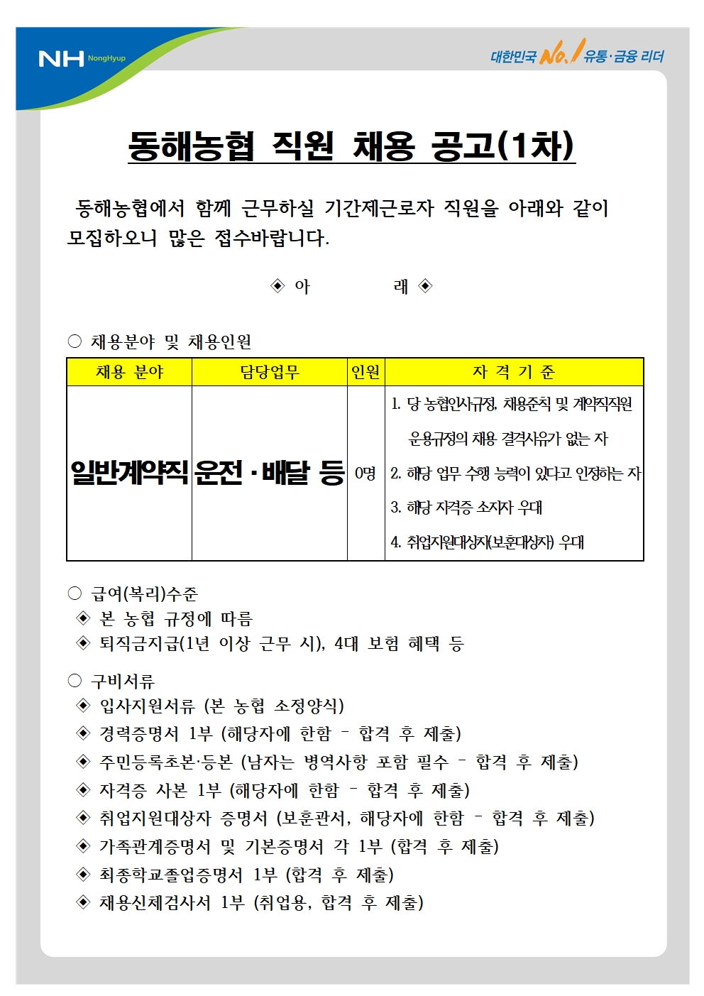 [동해시/구인] 기간제근로자 직원(운전·배달 등) 채용 공고 (1차)