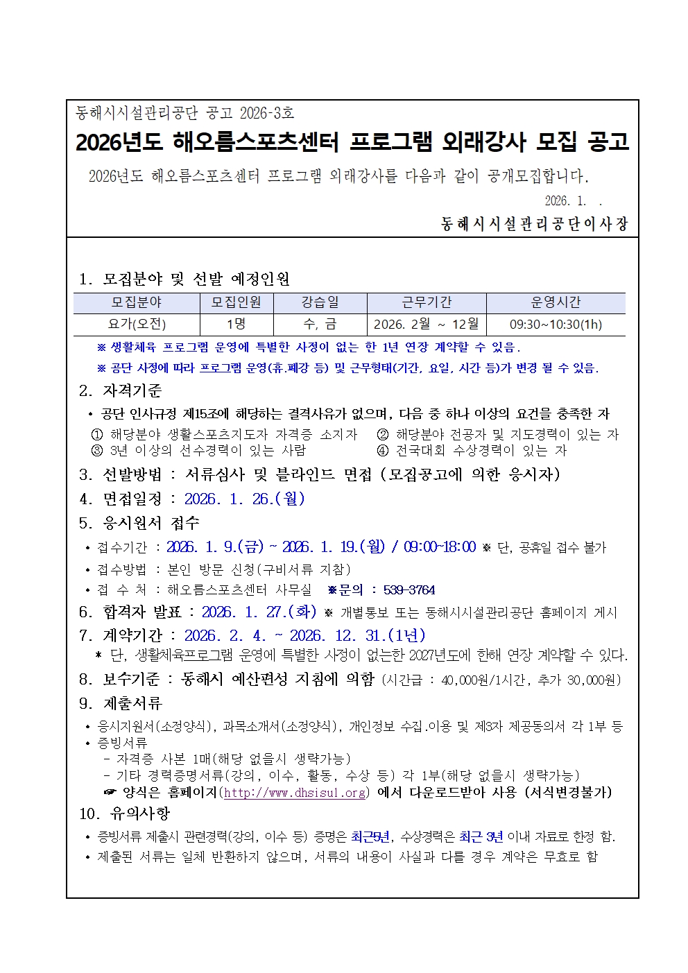 [동해시/구인] 2026년도 해오름스포츠센터 프로그램 외래강사 모집 공고 Home채용정보97487 윈디 윈디님의 홈 전체게시물 아이디로 검색 윈디님의 홈 전체게시물 아이디로 검색 2026.01.12 20:20 726 0 0 LV.1 62% 첨부파일 : 제출서류.hwp Content-Length: 64512 Vary: User-Agent Access-Control-Allow-Origin: https://eminwon.dh.go.kr Content-Security-Policy: object-src (63.0K) 다운로드 0 2026-01-12 20:20:02 관련링크 : https://www.dh.go.kr/www/selectBbsNttView.do;JSESSIONID=84CCE9F265C85623E34333941D25A912?key=745&bbsNo=125&nttNo=198384&searchCtgry=&searchCnd=all&searchKrwd=&integrDeptCode=&a… 100회 연결 신고 목록 게시글 신고 안내 아래 내용중 해당하는 내용이 있을경우 아래 게시글신고 버튼을 클릭하시고 사유를 작성해주시면 빠른시간 안에 삭제및 필요조치하여 드리겠습니다. 로그인후 이용이 가능합니다. 그리고 답변은 메뉴 아이러브강원 > 1:1문의에서 확인이 가능합니다. 자신 또는 제3자를 비방하거나 중상 모략으로 명예를 손상시키는 내용 범죄행위와 관련이 있다고 판단되는 내용 다른 회원 또는 제3자의 저작권 등 기타 권리를 침해하는 내용 타인의 개인정보, 사생활을 침해하거나 명예를 손상시키는 경우 자신의 글을 타인이 도용한 경우 위의 내용 이외에 기타사항 본문 이미지 확대보기 * 입사지원 서식은 아래 첨부파일을 확인하고, 지원하여 주시기 바랍니다. [출처 : 동해시청 -채용정보-] 0 로그인 후 추천을 하실 수 있습니다. 윈디 님의 최신글 윈디 님의 최신댓글 채용정보 - 주간보호 요양보호사 모집 2026-03-04 시군별소식 - 지방소득세(2025년귀속) 연말정산 환급신청 안내 2026-03-04 시군별소식 - 혈당 조절의 첫 걸음, 금연부터 시작해요! 2026-03-04 채용정보 - 매장 직원 모집 2026-03-04 시군별소식 - 수렵면허시험 문제은행 수정본 배포 2026-03-04 시군별소식 - 반려동물 놀이터 개장 안내 2026-03-04 시군별소식 - 2026 꿈꾸는 예술터 기획프로그램 개최 안내 2026-03-03 채용정보 - 2026년 영농부산물 안전처리 지원 기간제 근로자 채용공고 2026-03-03 Q&A - 청주시외버스터미널에서 춘천시외버스터미널에 가는 시외버스의 운행시간표랑 청주시외버스터미널에서 춘천시외버스터미널에 가는 시외버스의 요금입니다청주시외버스터미널에서 춘천시외버스터미널에 가는 시외버스의 운행시간표랑 청주시외버스터미널에서 춘천시외버스터미널에 가는 시외버스의 요금10:05 -> 13:11 소요시간 3시간 06분 요금 일반 21,800원 아동 10,900원 중고생 17,400원15:25 -> 18:31 소요시간 3시간 06분 요금 일반 21,800원 아동 10,900원 중고생 17,400원16:05 -> 19:11… 2026-03-07 Q&A - 조용하고 풍경 진짜 좋아요 ㅎㅎ 편의시설은 약간 부족해서 준비해 가는 게 낫답니다! 주변 맛집은 해산물 위주로 괜찮았어요~ 참고하세요! 2026-02-25 유머 - 부산, 울산, 대구에 눈오면 난리가 납니다. 1년에 눈다운 눈은 한번오면 많이 옵니다. 2026-02-20 유머 - 우와 뒤배도 눈으로? 2026-02-20 Q&A - 아시겠지만 각종 어플로 찾아보시면 질문자님 마음에 드는곳을 찾으실수있을거에요,~ 여기서보다 어플로보면 사진도 볼수있으니깐 더 마음이 놓일것같아요 ~ 좋은여행되시길바랍니다 2026-02-10 뽐&팁 - 좋은팁 감사해용.... 2025-07-07 윈디 님의 최신글 윈디 님의 최신댓글 채용정보 - 주간보호 요양보호사 모집 2026-03-04 시군별소식 - 지방소득세(2025년귀속) 연말정산 환급신청 안내 2026-03-04 시군별소식 - 혈당 조절의 첫 걸음, 금연부터 시작해요! 2026-03-04 채용정보 - 매장 직원 모집 2026-03-04 시군별소식 - 수렵면허시험 문제은행 수정본 배포 2026-03-04 시군별소식 - 반려동물 놀이터 개장 안내 2026-03-04 시군별소식 - 2026 꿈꾸는 예술터 기획프로그램 개최 안내 2026-03-03 채용정보 - 2026년 영농부산물 안전처리 지원 기간제 근로자 채용공고 2026-03-03 Q&A - 청주시외버스터미널에서 춘천시외버스터미널에 가는 시외버스의 운행시간표랑 청주시외버스터미널에서 춘천시외버스터미널에 가는 시외버스의 요금입니다청주시외버스터미널에서 춘천시외버스터미널에 가는 시외버스의 운행시간표랑 청주시외버스터미널에서 춘천시외버스터미널에 가는 시외버스의 요금10:05 -> 13:11 소요시간 3시간 06분 요금 일반 21,800원 아동 10,900원 중고생 17,400원15:25 -> 18:31 소요시간 3시간 06분 요금 일반 21,800원 아동 10,900원 중고생 17,400원16:05 -> 19:11… 2026-03-07 Q&A - 조용하고 풍경 진짜 좋아요 ㅎㅎ 편의시설은 약간 부족해서 준비해 가는 게 낫답니다! 주변 맛집은 해산물 위주로 괜찮았어요~ 참고하세요! 2026-02-25 유머 - 부산, 울산, 대구에 눈오면 난리가 납니다. 1년에 눈다운 눈은 한번오면 많이 옵니다. 2026-02-20 유머 - 우와 뒤배도 눈으로? 2026-02-20 Q&A - 아시겠지만 각종 어플로 찾아보시면 질문자님 마음에 드는곳을 찾으실수있을거에요,~ 여기서보다 어플로보면 사진도 볼수있으니깐 더 마음이 놓일것같아요 ~ 좋은여행되시길바랍니다 2026-02-10 뽐&팁 - 좋은팁 감사해용.... 2025-07-07 SNS 댓글목록 0 등록된 댓글이 없습니다.