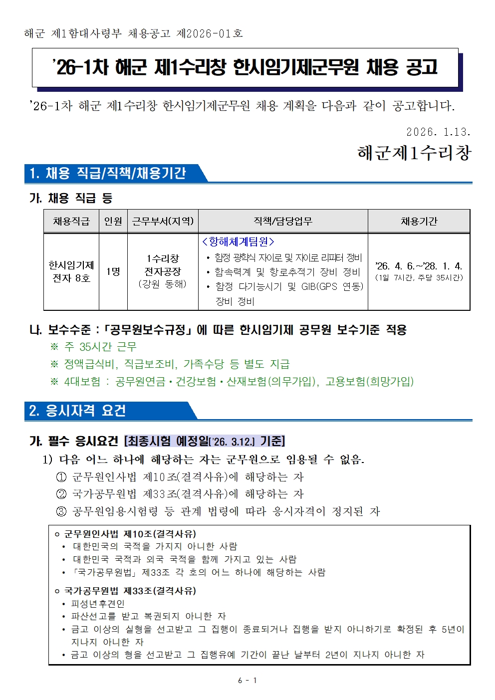 [동해시/구인] ’26-1차 해군 제1수리창 한시임기제 군무원 채용 공고