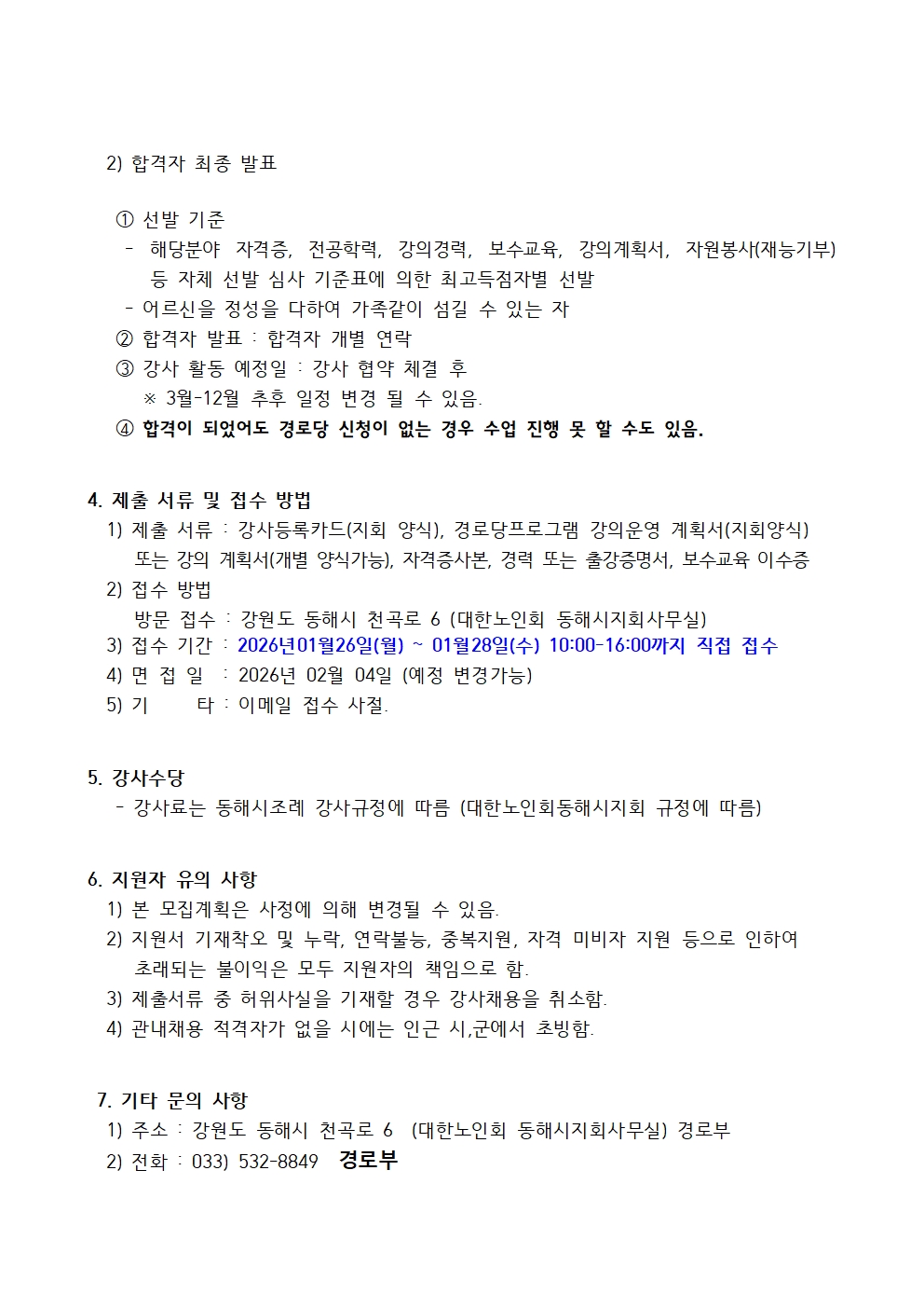 [동해시/구인] < 대한노인회 동해시지회 > 경로당 순회프로그램 강사 모집