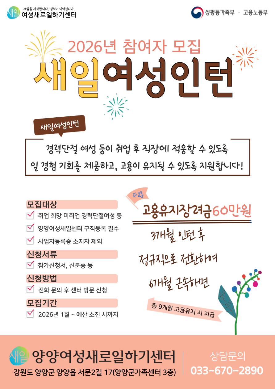 양양여성새로일하기센터에서 2026년 새일여성인턴 사업 참여자를 모집하고 있습니다.
