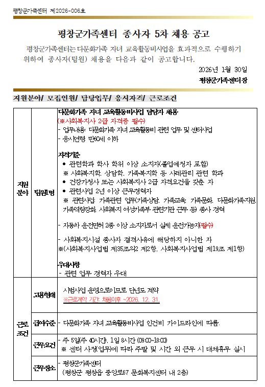 [평창군/구인] 평창군가족센터 종사자(교육활동비 팀원) 5차 채용 공고