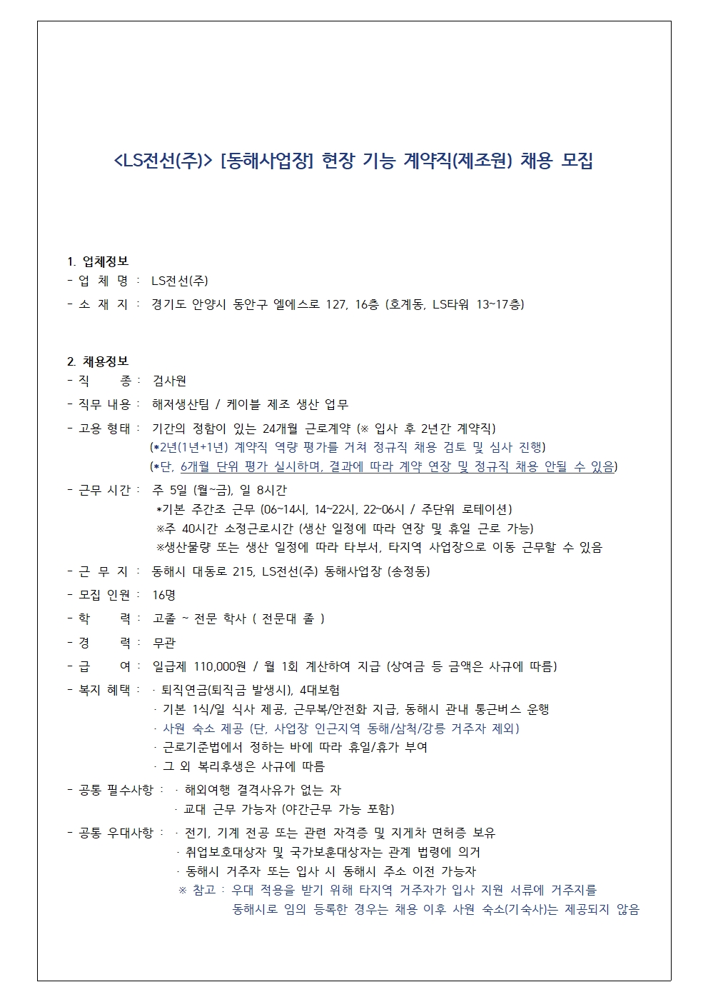 [동해시/구인] [동해사업장] 현장 기능 계약직(제조원) 채용 모집