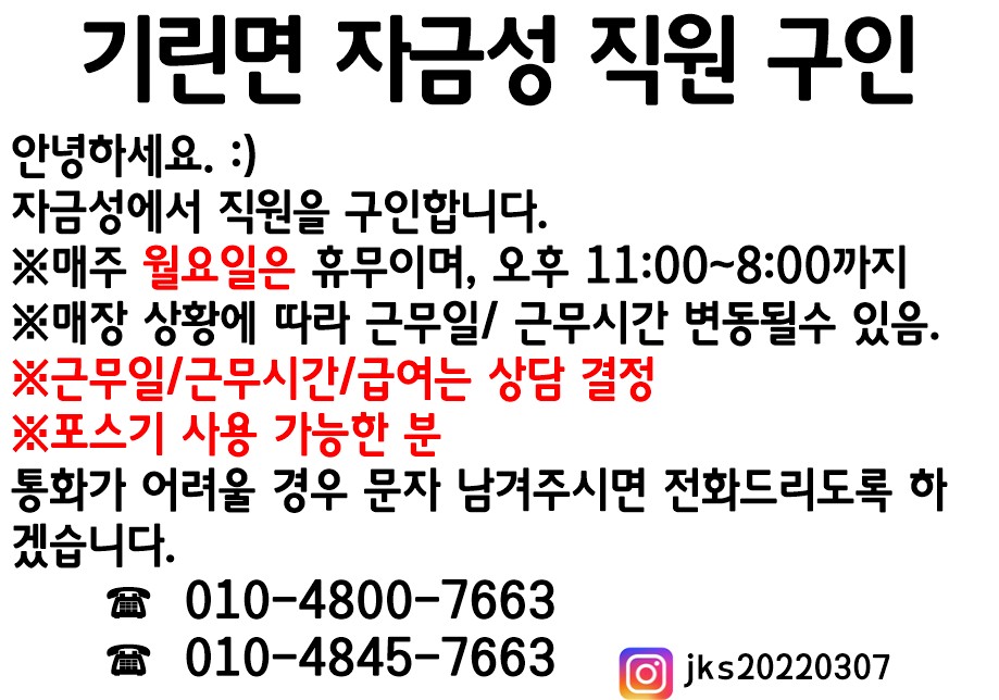 [인제군/구인] 기린면 자금성에서 직원 구인합니다. Home채용정보98455 소셜우주 소셜우주님의 홈 전체게시물 아이디로 검색 소셜우주님의 홈 전체게시물 아이디로 검색 2026.02.20 20:20 445 0 0 LV.1 69% 관련링크 : https://www.inje.go.kr/portal/participation/job?articleSeq=246943 63회 연결 신고 목록 게시글 신고 안내 아래 내용중 해당하는 내용이 있을경우 아래 게시글신고 버튼을 클릭하시고 사유를 작성해주시면 빠른시간 안에 삭제및 필요조치하여 드리겠습니다. 로그인후 이용이 가능합니다. 그리고 답변은 메뉴 아이러브강원 > 1:1문의에서 확인이 가능합니다. 자신 또는 제3자를 비방하거나 중상 모략으로 명예를 손상시키는 내용 범죄행위와 관련이 있다고 판단되는 내용 다른 회원 또는 제3자의 저작권 등 기타 권리를 침해하는 내용 타인의 개인정보, 사생활을 침해하거나 명예를 손상시키는 경우 자신의 글을 타인이 도용한 경우 위의 내용 이외에 기타사항 본문 기린면 자금성에서 직원 구인합니다. [출처 : 인제군청 -채용정보-] 0 로그인 후 추천을 하실 수 있습니다. 소셜우주 님의 최신글 소셜우주 님의 최신댓글 채용정보 - 직장 행복어린이집 보육교직원(연장보육전담교사) 채요공고 2시간 1분전 채용정보 - 작은공재가돌봄센터에서 함께할 요양보호사 선생님을 모십니다 2시간 1분전 채용정보 - 봉면 아틀리에 단기 시간 근무원하시는 분 (주 5일, 점심만) 6시간 1분전 채용정보 - 2026년 인제교육지원청 소속 기간제 교육공무직(조리실무사) 채용 18시간 1분전 채용정보 - 빛나라 어린이집 연장교사 채용 18시간 1분전 채용정보 - 트리헌드레드 카페에서 함께 일할 직원을 찾습니다. 18시간 1분전 시군별소식 - 26년 봄철 꿀벌응애 방역수칙을 안내 2026-03-09 채용정보 - 믹서트럭(지입)모집-상인산업(주) 2026-03-09 최신글이 없습니다. 소셜우주 님의 최신글 소셜우주 님의 최신댓글 채용정보 - 직장 행복어린이집 보육교직원(연장보육전담교사) 채요공고 2시간 1분전 채용정보 - 작은공재가돌봄센터에서 함께할 요양보호사 선생님을 모십니다 2시간 1분전 채용정보 - 봉면 아틀리에 단기 시간 근무원하시는 분 (주 5일, 점심만) 6시간 1분전 채용정보 - 2026년 인제교육지원청 소속 기간제 교육공무직(조리실무사) 채용 18시간 1분전 채용정보 - 빛나라 어린이집 연장교사 채용 18시간 1분전 채용정보 - 트리헌드레드 카페에서 함께 일할 직원을 찾습니다. 18시간 1분전 시군별소식 - 26년 봄철 꿀벌응애 방역수칙을 안내 2026-03-09 채용정보 - 믹서트럭(지입)모집-상인산업(주) 2026-03-09 최신글이 없습니다. SNS 댓글목록 0 등록된 댓글이 없습니다.