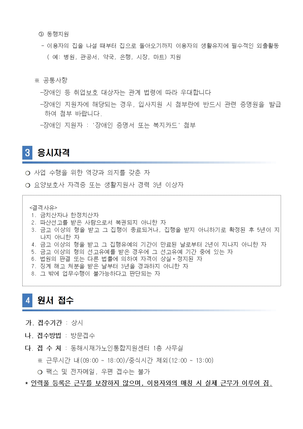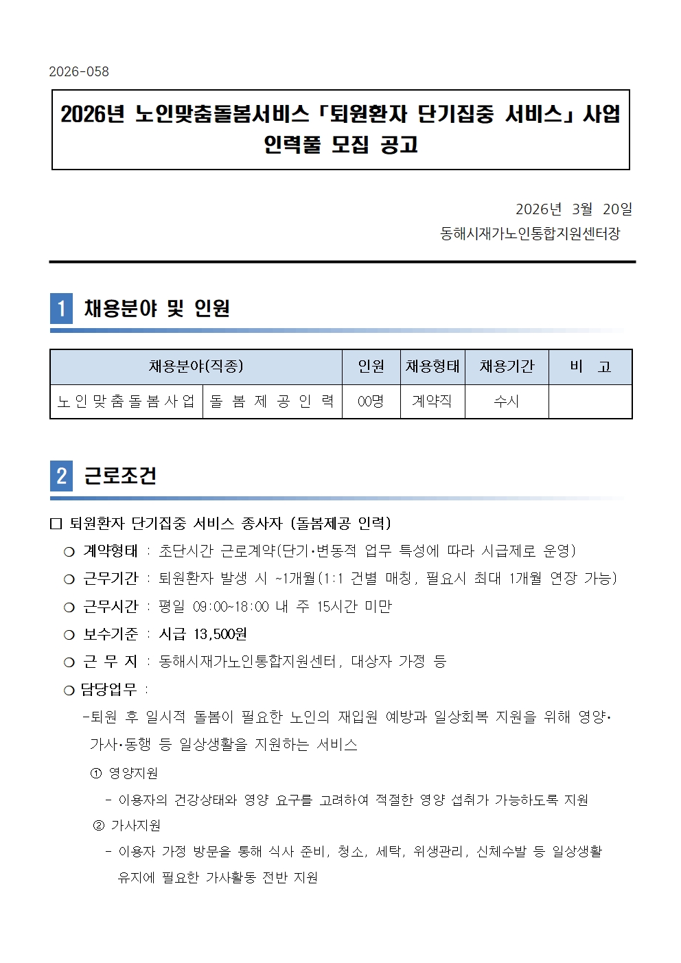 [동해시/구인] 2026년 노인맞춤돌봄서비스「퇴원환자 단기집중 서비스」사업 인력풀 모집 공고