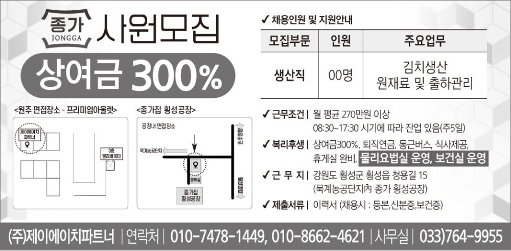 - 근무지: 강원도 횡성군 횡성읍 청용길 15 (묵계농공단지 종가 횡성공장)