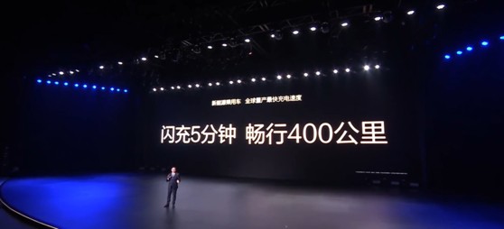 지난 3월 17일 왕촨푸 비야디(BYD) 회장 중국 선전 BYD 본사에서 발표회를 열고 5분 충전으로 400㎞를 주행할 수 있는 '슈퍼 e-플랫폼'을 출시한다고 밝히는 모습. BYD 웨이보 캡처