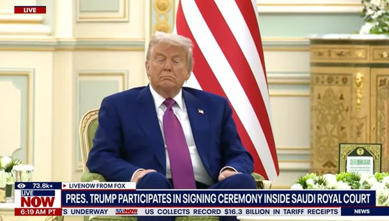 미국의 한 언론인은 이 장면이 담긴 동영상을 엑스에 공유하면서 "트럼프가 사우디아라비아에서 눈을 뜨고 있기를 힘들어하고 있다"고 적었다.