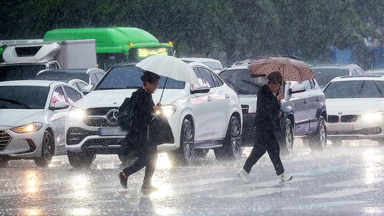 비가 내린 지난달 16일 서울 광화문사거리에서 시민들이 우산을 쓴 채 이동하고 있다. 연합뉴스
