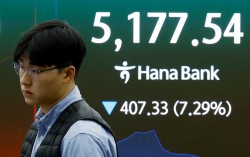 9일 서울 중구 하나은행 딜링룸 전광판에 코스피 등 시황이 표시되고 있다. 이날 코스피는 전 거래일 대비5.72% 내린 5265.37, 코스닥은 5.04% 내린 1096.48에 개장했다. 뉴스1 코스피 지수가 9일 장 초반 폭락하고 있다. 매도사이드카(프로그램…
