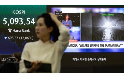 4일 코스피가 전날보다 698.37포인트(12.06%) 하락한 5093.54에 마감했다. 낙폭과 하락률 모두 역대 최고 기록이다. 코스닥도 1000선이 무너졌다. 이날 서울 중구 하나은행 딜링룸 전광판에 종가와 함께 미국·이스라엘과 이란 간 전쟁 뉴스가 나오고 있다. …