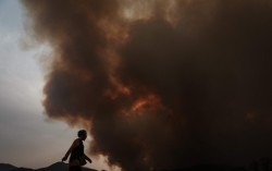3월 24일 경북 의성군에서 발생한 산불로 연기가 뿜어져 나오는 가운데 한 시민이 주변을 지나고 있다. AFP=연합뉴스 기후변화로 인해 한국에서 대형 산불을 일으킬 수 있는 기상 조건의 출현 가능성이 두 배로 증가했다는 분석이 나왔다. 지난달 경북 산불처…